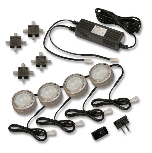 The Westek Xenon 12V Low Voltage Accent Lights are perfect for kitchens, china cabinets, work stations, display cases, entertainment centers and more. Whiter, more natural Xenon bulbs burn cooler and last longer than halogen bulbs. It's easy to build your own Xenon Lighting System from one to eighteen lights! Simply snap together for a safe and convenient installation. No wiring needed! Just a neat, clean installation that hides under your cabinets and gives you a warm glow to light up any room. For an even lower profile, the Westek low voltage accent lights can be recess mounted in a cabinet. Also dimmable with Westek A6043BC touch pad dimmer (sold separately). Available in white, nickel, and bronze finishes and 2, 3, and 4 pack kits. Box includes everything you need to install your system. Four 20 Watt accent lights, 120W transformer with auto reset and short circuit protection, polarized power plug (crimp-on type), on/off cord switch, power block, mounting hardware, and complete instructions. You can add additional accent lights, transformers, dimmers and more to expand and control your cabinet lights.Nickel finish perfect accent for any color cabinetsCan be surface or recess mountedRequires 4 20-watt halogen bulbs (included)4-light, low voltage xenon puck lightsDimmable with Westek A6043CS touch pad dimmer (sold separately)