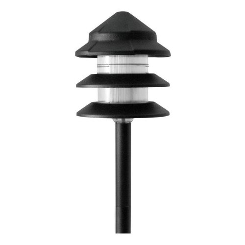 Path light 3 tier Ribbed plastic diffuser 12 volt Includes 7 watt incandescent wedge bulb Stamped aluminum construction Black