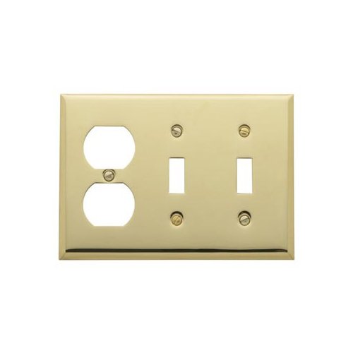 Switchplate:Combo Outlet - Double Toggle - Classic, Finish:Polished Brass These classic switch/receptacle combination plates have square, beveled edges and are forged from solid brass. Available in a wide variety of durable Baldwin finishes. Also available in several configurations. See options to select finish type and configuration. Sold individually. Note: Product finishes which are RELIEVED may vary in luster, hue, and appearance as a result of handcrafted variances in the final finishing step.