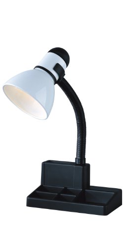 This incandescent organizer desk lamp is perfect for any desk or project you may need it for. Adjustable gooseneck column allows it to be positioned in a lot of different ways. It has a white finish with a black base and an oversized turn knob switch. It is UL listed. Bulb not included.
