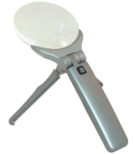 Magnify and illuminate whatever you are reading with this innovative unit. Great for newspapers, receipts, menus, maps and hobbies. Unique folding handle/stand allows you to either hold the magnifier or place it on a table. With 3X/5X magnifying lens and two super bright white LEDs. Three-way switch with hi/lo light level. Silver finish. Two super bright white LEDs. 3X/5X magnifying lens. Takes three AAA batteries (not included). 9" high.