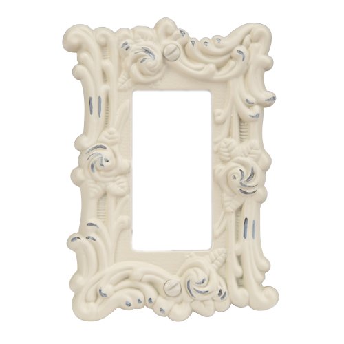 - Antique white cast metal wallplate designed with ornate scrolls and delicate rosebuds