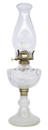 This kerosene/oil lamp gives a classic elegant touch to your home. The lamp measures 17-1/2-inch tall has a clear glass font, standard 3-inch burner and glass globe.