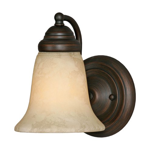 Golden Lighting's Centennial RBZ Wall Sconce fixture - 5661 RBZ Bath fixtures may be mounted with the glass facing up or down. Collection's scale is perfect for lower ceilings Warm Tea Stone glass Affordably priced, fashion forward collection Also available in Pewter Popularly used in halls, stairways, entrys and as an accent. UL listed Damp location for use in bathroom or under an eave Centennial RBZ Rubbed Bronze Width: 5.5 Height: 8 Extension: 7 Wire Length: 8" Glass / Shade Finish: Tea Stone Glass Glass / Shade Diameter: 5.5 Glass / Shade Height: 5.25 Canopy / Backplage Dimension: 5.125"Dia x 1.375"E Fixture Wattage: 1 x 100W(M) UL Listing: damp Number of Sockets: 1 Max Wattage: 100W Total Wattage: 100W Bulb Type: Incandescent, Type A Bulb Included: No Material Steel / Glass